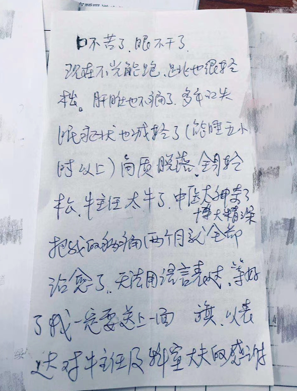 在2020年6月的时候,刘女士忽然感到肝区疼痛,疼了四五次,一次比一次疼的厉害,尤其到了晚上疼的厉害,刘女士又是一个急脾气,对自己的身体情况感到很生气,很失望,子女也不在身边照顾,也不愿意让孩子们过多担心自己而去打扰他们,刘女士难过的时候,经常深夜落泪,几次动心做了写遗书的准备。后来经朋友介绍,来到牛小培主任门诊看诊。