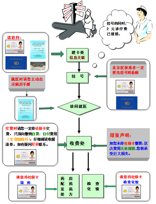 当您来我院就医时,请务必带上社保卡、《北京市基本医疗保险手册》(以下简称《医保手册》)和北京市卫生局规定使用的《北京地区医疗机构门急诊病历手册》(以下简称《病历手册》)。您的手上无论是否持有我院的就诊卡,在挂号前请您一定要主动出示社保卡、《医保手册》先到建卡处去进行信息关联,然后再到挂号处去挂号。一定要先挂号,再看病,否则此次所发生的门诊费用无处报销。